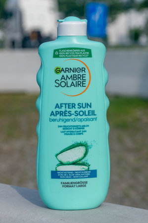 Ansfelden, Austria - June 2, 2024: Garnier Ambre Solaire after sun lait hydratant.