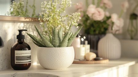 A tranquil bathroom setup featuring an aloe vera plant, elegant skincare products, and delicate floral arrangements, evoking a sense of relaxation and natural beauty.
