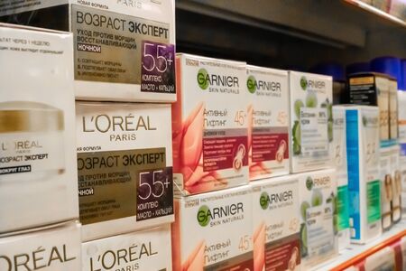 loreal and garnier cosmetic products for sale on a supermarket shelf. Loreal and garnier brand for skin