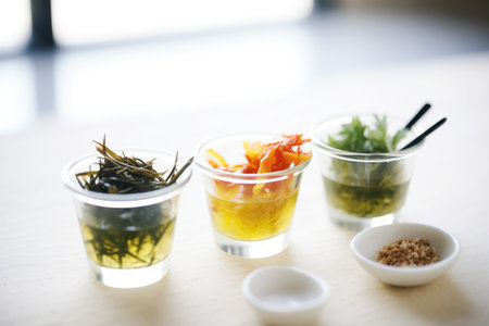Flavoring set on white tray for customer service in Japanese restaurants.