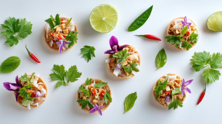 Minimalist food styling showcasing fresh ingredients like tomatoes, lemon slices, and herbs on a clean, white background. The simplicity and elegance make it ideal for culinary, health, and organic food themes.
