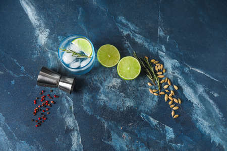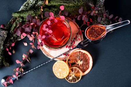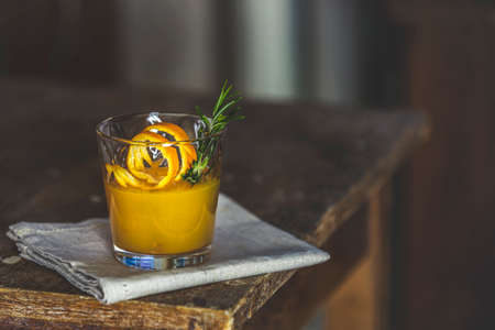 Honey bourbon cocktail with rosemary simple syrup or homemade whiskey sour cocktail drink with orange and rosemary. Decorate orange peel. Old rustic style.