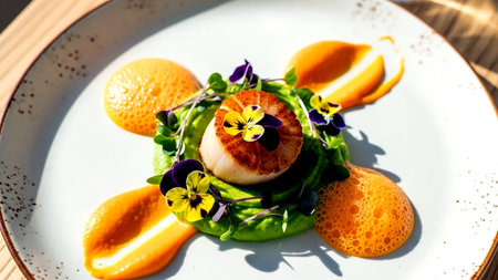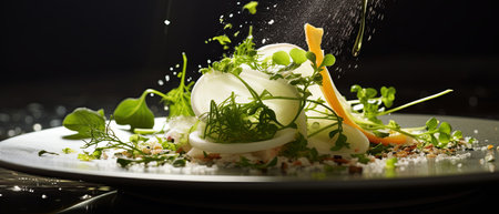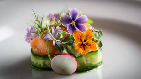 Culinary art is a harmonious combination of fresh ingredients of the highest quality. The elegant fusion showcases the chef's attention to detail. The background is softly blurred, drawing attention to the culinary masterpiece in the foreground.