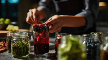Bartender preparing colorful cocktail with fresh berries and herbs