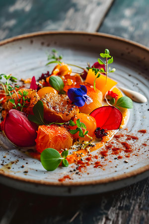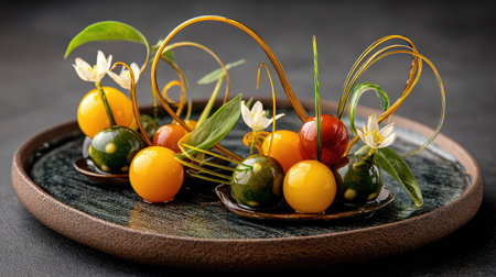 A vibrant and artistic culinary creation showcases seasonal vegetables, fresh fruits, and delicate garnishes arranged beautifully on a dark plate.