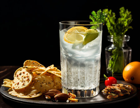 AI Generated. Delicious food arranged on a plate with herbs and beverage