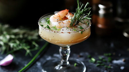 A stunning seafood cocktail featuring shrimp, herbs, and flavorful garnishes, creating a refreshing drink perfect for any gourmet occasion or summer gathering.