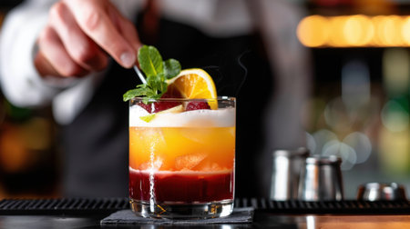 A skilled bartender artfully prepares a vibrant layered cocktail adorned with fresh fruit and herbs, showcasing a lively bar ambiance.