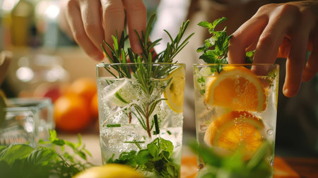 A close-up of a beautifully crafted cocktail being garnished with fresh herbs and citrus slices