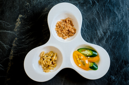 Garlic cracklings with lard, pickled chili, and coriander with spring onion various ingredients and condiment on table for noodles menu. Copy space for your text.