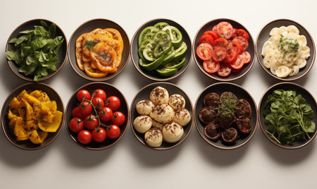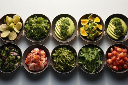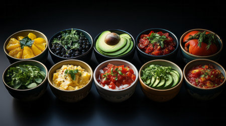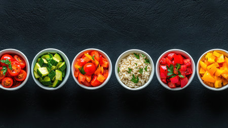 A stunning arrangement of fresh colorful ingredients in individual bowls, perfect for meal preparation and healthy cooking. Vibrant and nutritious options ready for your next dish.