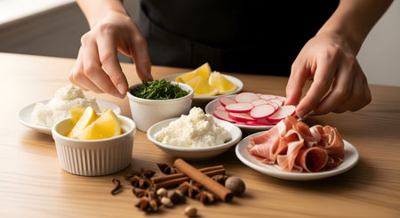 A close-up of a person's hands organizing various fresh ingredients in small white bowls on a wooden table. The spread includes ricotta cheese, chopped herbs, sliced radishes, lemon wedges, and prosciutto, ready for cooking.