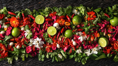 A vibrant and colorful display of fresh vegetables, herbs, and flowers arranged in an artistic layout, perfect for culinary inspiration or decoration.