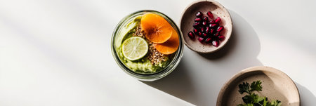 A vibrant jar breakfast showcases layers of spinach, orange slices, pomegranate seeds, and pine nuts arranged artfully. Morning light casts long shadows over the healthy meal, banner