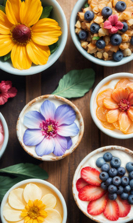 Colorful Yogurt Bowls with Fresh Fruits and Edible Flowers