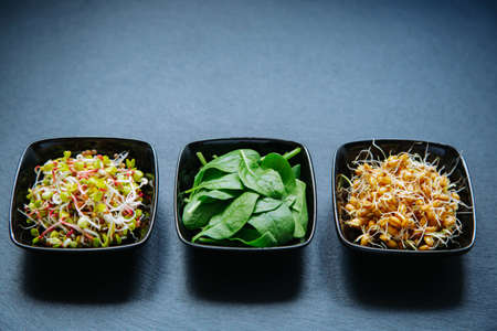 Variety of salads in black bowls on black background. Top view.