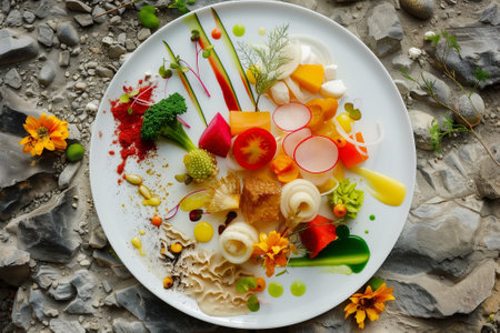 Fine dining top view a plate of organic sculptural food. By generative Ai