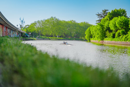 A rowing boat on the Garonne River in front of La Grave, in Toulouse, Haute Garonne, Occitanie, France