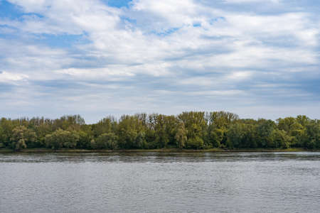Simple, idyllic view of river, forest and blue sky with clouds.