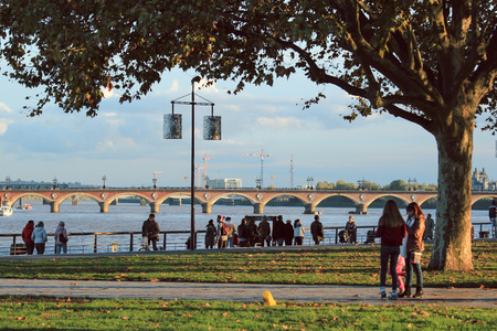 FRANCE, BORDEAUX - OCTOBER 29, 2016 : View of Pont de Pierre bridge from quay of Bordeaux city in a beautiful weather day