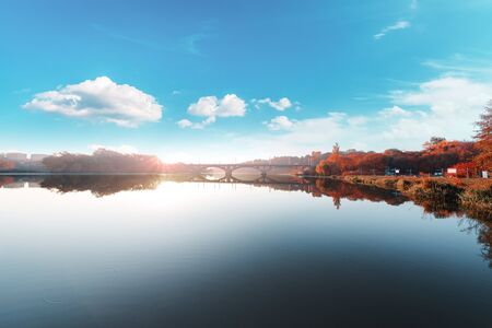Golden autumn trees line the riverbank, reflecting in the calm water under a clear blue sky. A peaceful cityscape captured on a sunny morning