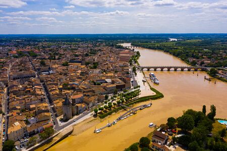 Aerial view of Libourne cityscape on banks of Dordogne river overlooking Gothic spire of Church of St. John Baptist, France