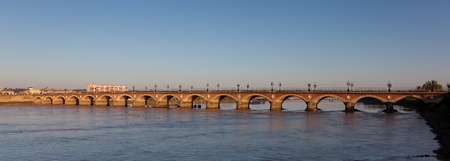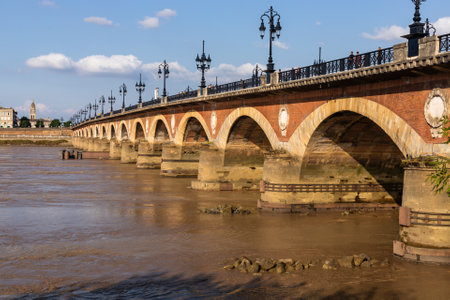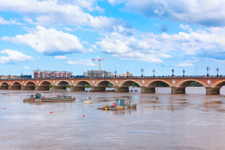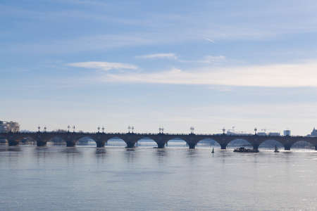 Famous Bridge in Bordeaux . Flowing Garonne River and Arched Pierre Bridge