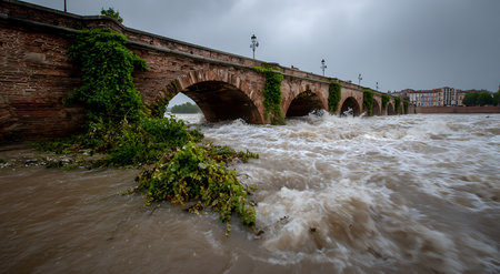 A powerful flood surge rushes under the arches of an old stone bridge. Debris, including branches and vegetation, is carried along by the fast-moving, turbulent water. The scene depicts the destructive force of a high river during a storm.