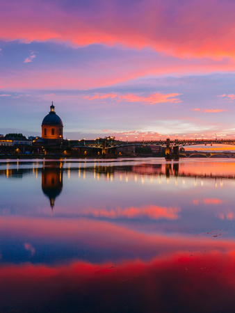 Pink and blue sunset over Garonne River, with reflections of Saint-Pierre Bridge and Chapel of hopital Saint-Joseph de la Grave, in Toulouse, France