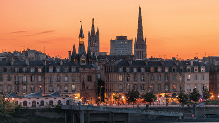 Panoramic view of Bordeaux city skyline day to night transition timelapse. France