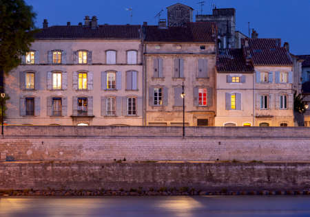 Arles. City embankment and facades of old houses at sunset.