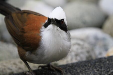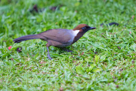 Chestnut-capped Laughingthrush bird, known as the spectacled laughingthrush with white eye ring, gray plumage and orange brown cap found at Fraser’s hill, Malaysia, Asia (Garrulax mitratus)