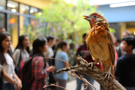 Orange-breasted starling perched on a branch with red flowers. ai generated