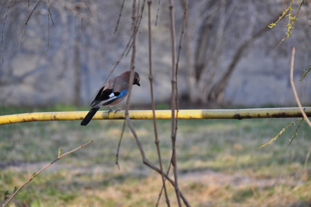 Eurasian Jay ,Garrulus glandarius, sits on branches almost without leaves in an forest