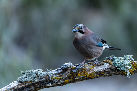 Portrait of an oak jay on a branch in the forest during winter. (Garrulus glandarius). France.