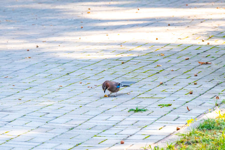 Jay bird eats from the ground in Bielaviezskaja Pusca National Park Bialowieza Forest Kamyanyets District Brest Region Belarus.