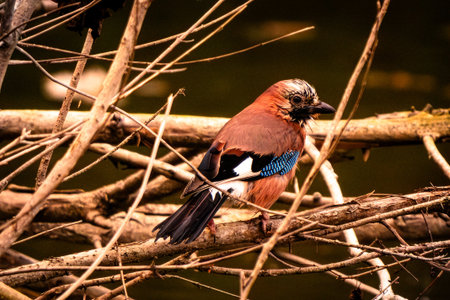 Eurasian jay (Garrulus glandarius) bird perched on tree branch with blurred brown background