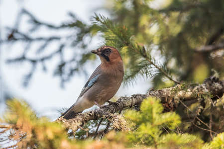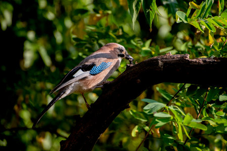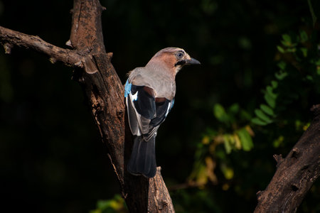 Eurasian jay Garrulus glandarius bird perched in a forest tree. Natural daylight, selective focus