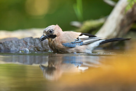 Portrait of nice passerine bird Eurasian Jay (Garrulus glandarius), bath in forest pond in morning sun during spring. Close-up portrait of bird.
