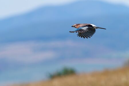 Eurasian jay, Garrulus glandarius flying in nature habitat.