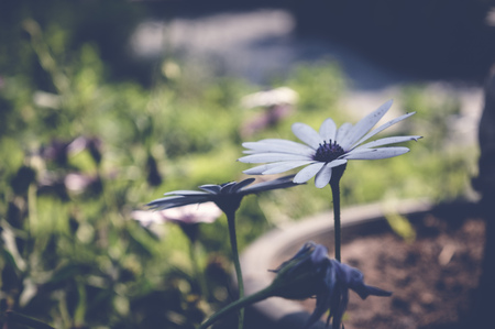 A tiny purple daisy blooms in the garden