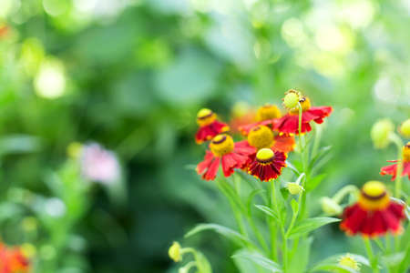 focus on orange flowers helenium on the green background, note shallow depth of field