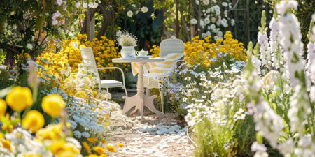 Scenic garden path with colorful flowers blooming on each side, creating a vibrant and peaceful atmosphere