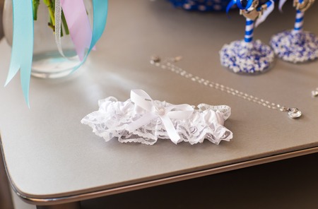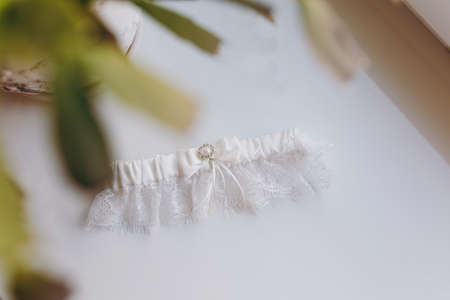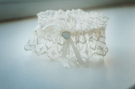 Close up Elegant gentle white wedding garter on elastic band with exquisite lace, bow and decoration for the bride on a white gloss windowsill background. Wedding wear, accessories.