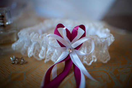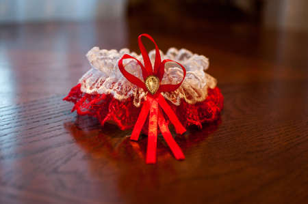 Red bride garter on brown background