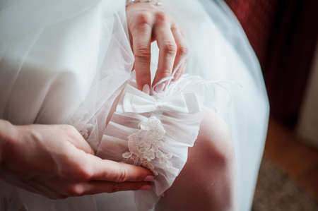 Garter of the bride on the leg of the bride