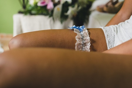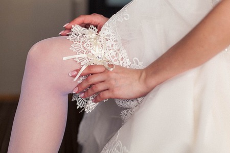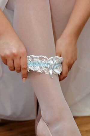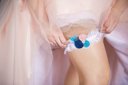 Morning of the bride when she wears a wedding garter on leg,woman getting ready before ceremony
