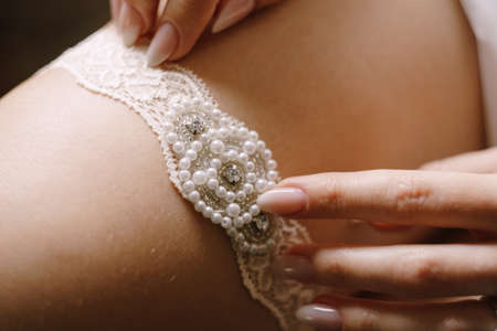 the bride with a French manicure holds a white garter in her hands. Close-up photo. The bride puts on a wedding garter and prepares for the wedding