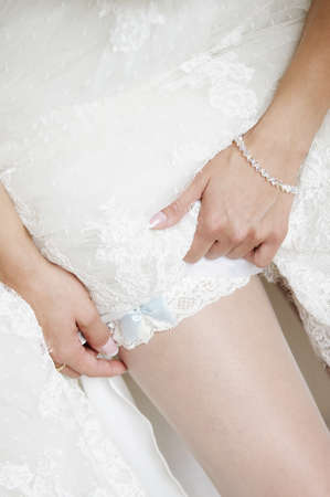 Bride preparing for her wedding, putting on the garter and lingerie
