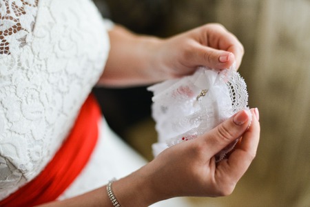 Bride holding red and white garter in the hands